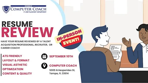 Tuesday at 12 noon at Computer Coach (Tampa): Computer Coach will be holding an in-person resume review at their office. 75% of resumes are never seen by human eyes due to applicant tracking systems (ATS);
