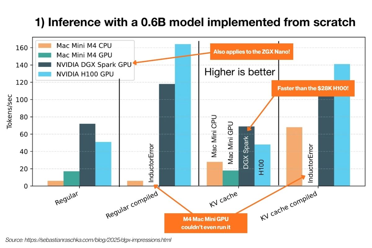 In his first set of benchmarks, he took a home-built 600 million parameter LLM — the kind that you learn how to build in his book, Build a Large Language Model (from Scratch) — and ran it on his Mac Mini M4, the ZGX Nano’s twin cousin, and an H100 from a cloud provider. From his observations, you can conclude that: