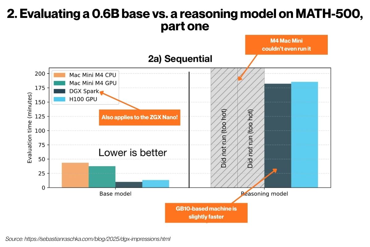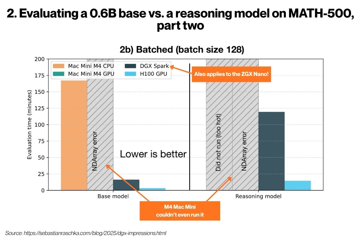 Raschka’s second set of benchmarks tested how the Mac Mini, the ZGX Nano’s twin cousin, and the H100 handle two variants of a model that have been presented with MATH-500, a collection of 500 mathematical word problems: