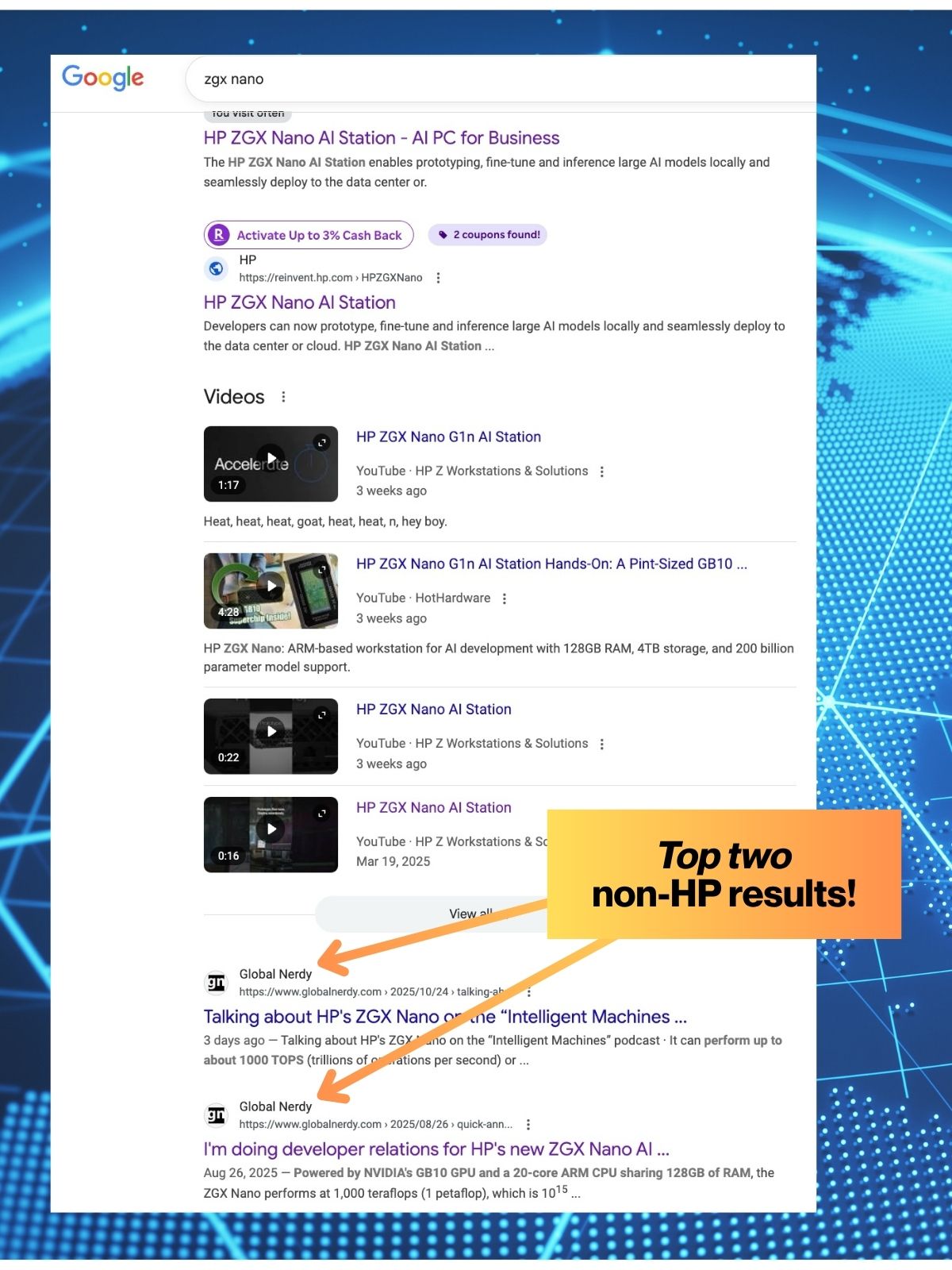 With me, you’re not just getting a developer advocate, but someone with a tech blog going back nearly two decades and with the domain authority to take on with Fortune 500 companies on Google. My Global Nerdy posts about ZGX Nano rank on page one because Google trusts content I’ve been building since 2006.