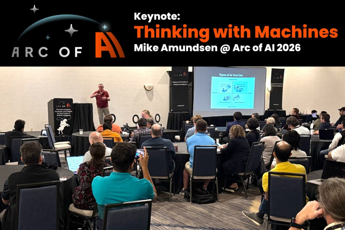 I’ve been to enough tech conferences to develop a finely-tuned radar for keynotes that are actually worth your time versus ones that are just vibes and venture capital optimism dressed up in slide decks. Mike Amundsen’s Wednesday afternoon keynote at Arc of AI in Austin — titled Thinking with Machines — landed firmly in the former category. I’m still chewing on it, which is the best possible sign.
