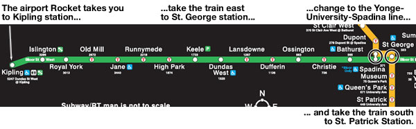 Once you’re at Kipling station, take the train east to St. George station. At St. George station, you’ll go up one floor, which takes you to the north-south-running trains on the Yonge-University-Spadina line. Take the train south to St. Patrick station.