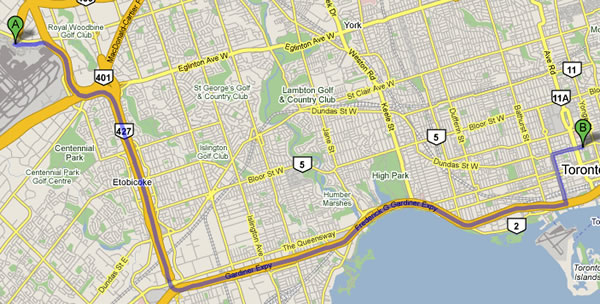 Google Map showing directions from Pearson Airport to the Metropolitan.