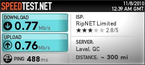 For those of you curious about the wifi on the train, SpeedTest.net reports that that I’m getting a download speed of 0.77 Mb/s and an upload speed of 0.76 Mb/s (you can see their report to the right). It’s usable for email, web, social networking and even for testing networked Windows Phone 7 apps in the emulator. It’s certainly not for downloading large files, and they block access to high-bandwidth sites like YouTube. It’s still better than the complete lack of internet access on most flight, and if I had higher-bandwidth needs, I could always switch to my internet stick.