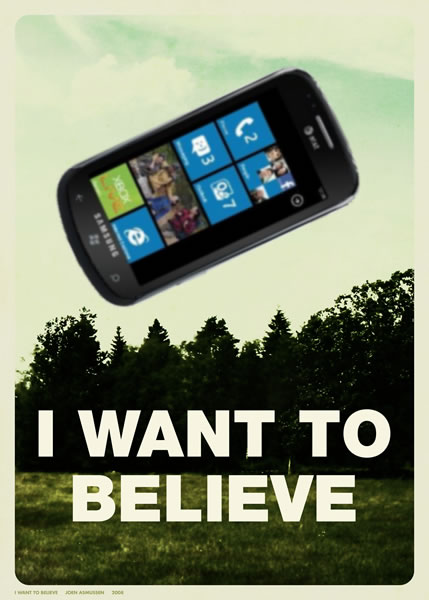 "I Want to Believe" poster from "The X-Files", with the flying saucer replaced by a giant Windows Phone