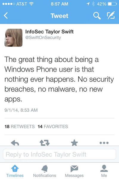 Categories Uncategorized InfoSec Taylor Swift on Windows Phone security Post author By Joey deVilla Post date September 6, 2014 Click the screen capture to see the original tweet. It’s tweets like this that make her my favorite singer/songwriter/information security expert. ← This fall’s new phones at IFA 2014 → What I’d love to see at Tuesday’s Apple unveiling