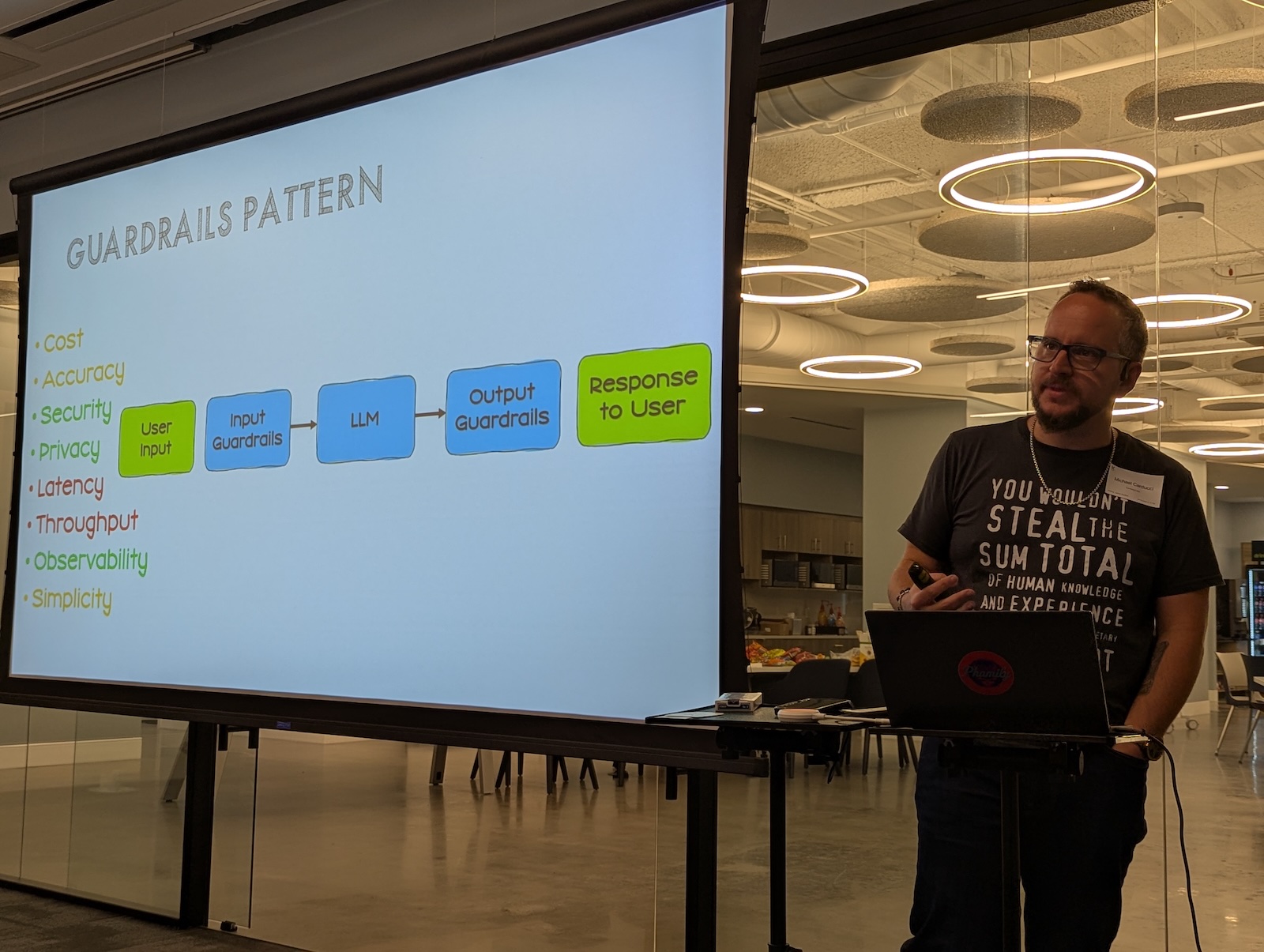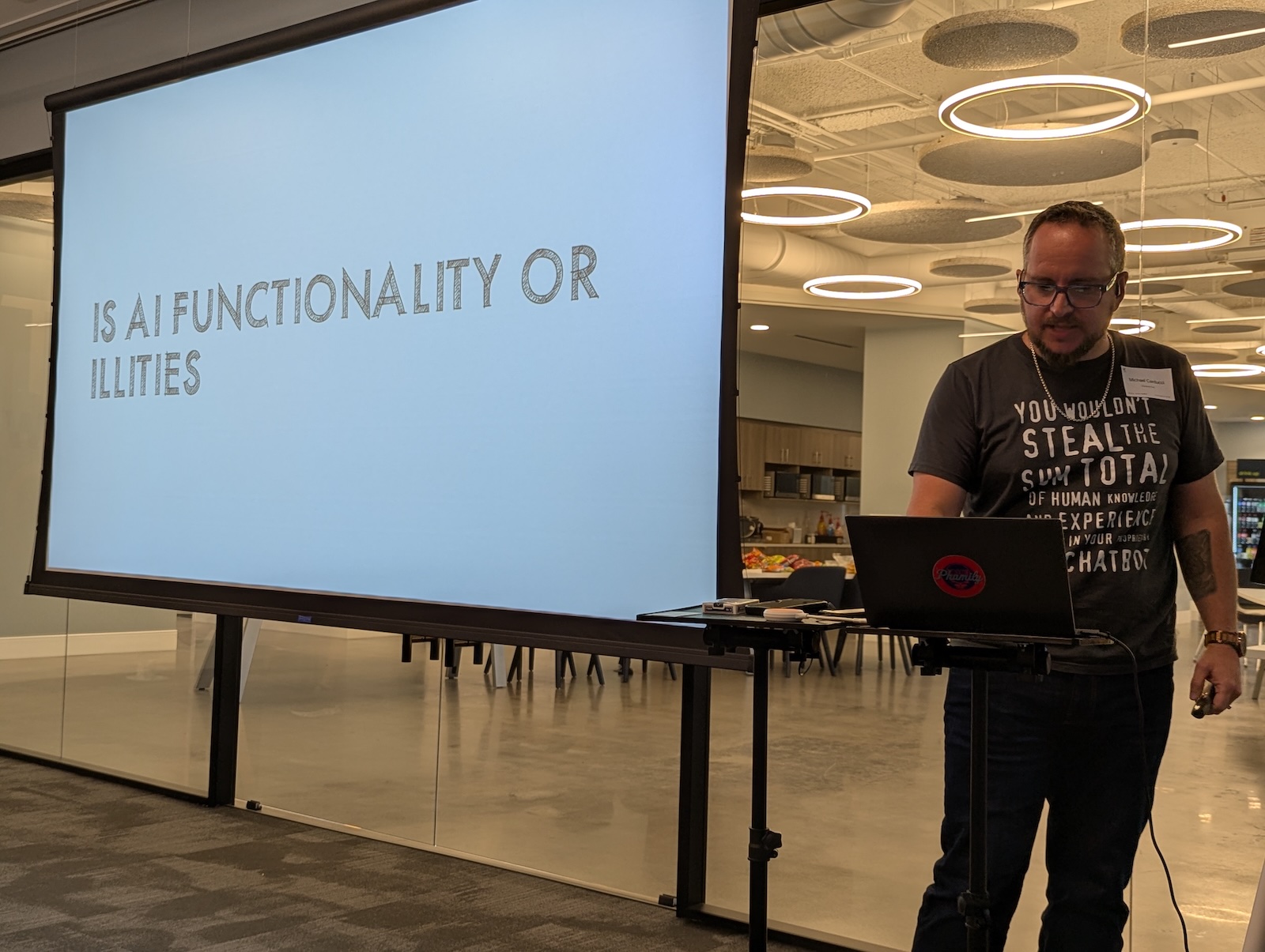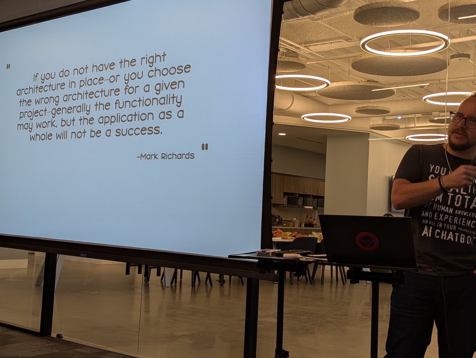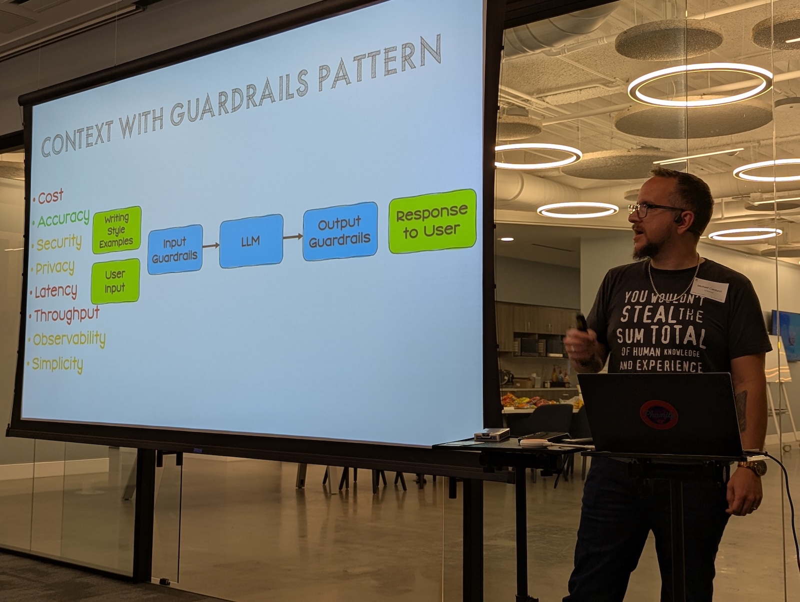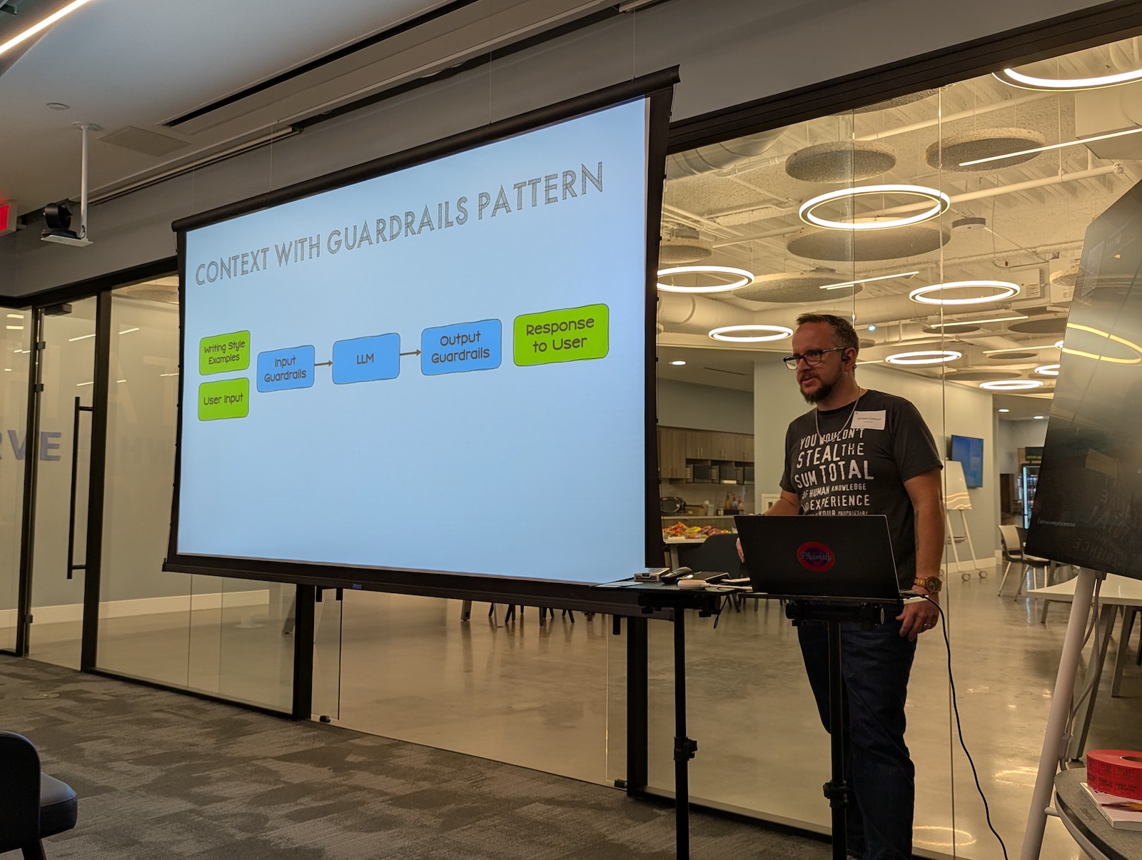 Last night, we had a “standing room only” crowd at Michael Carducci’s presentation, Architecture Patterns for AI-Powered Applications, which was held jointly by Tampa Java User Group, Tampa Devs, and Tampa Bay Artificial Intelligence Meetup (which Anitra and I co-organize).