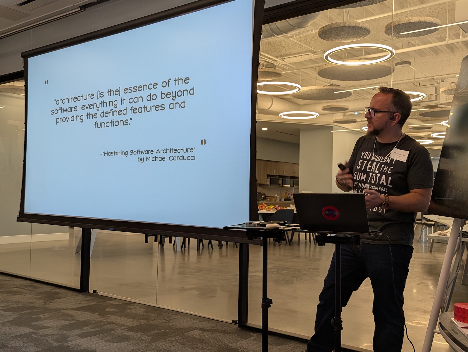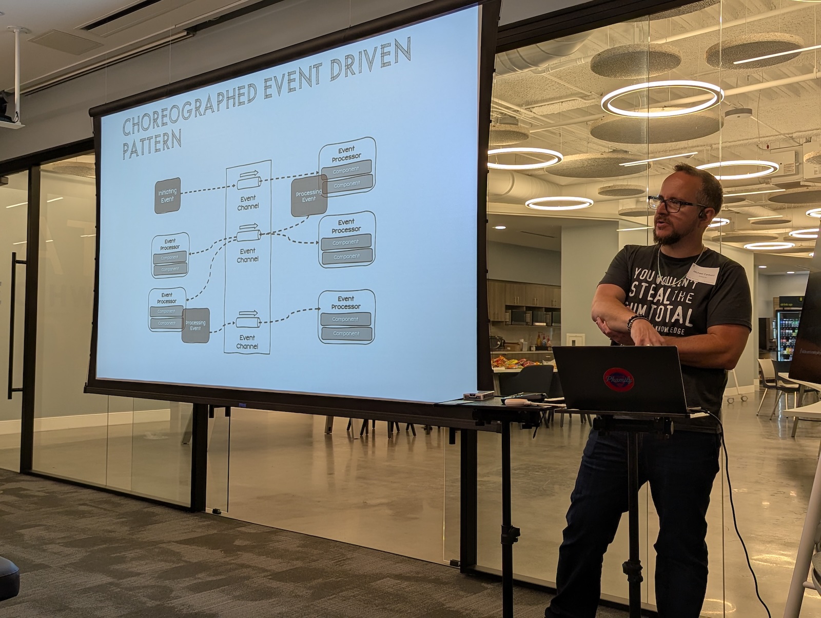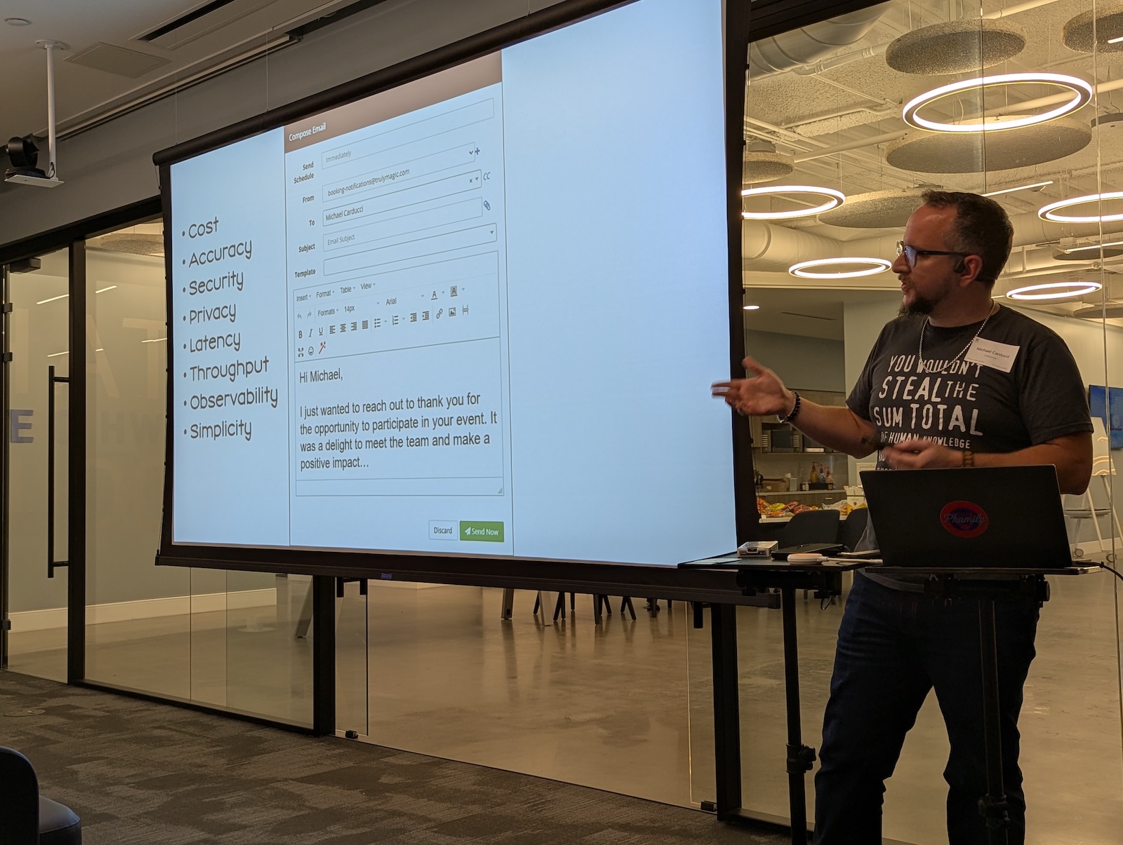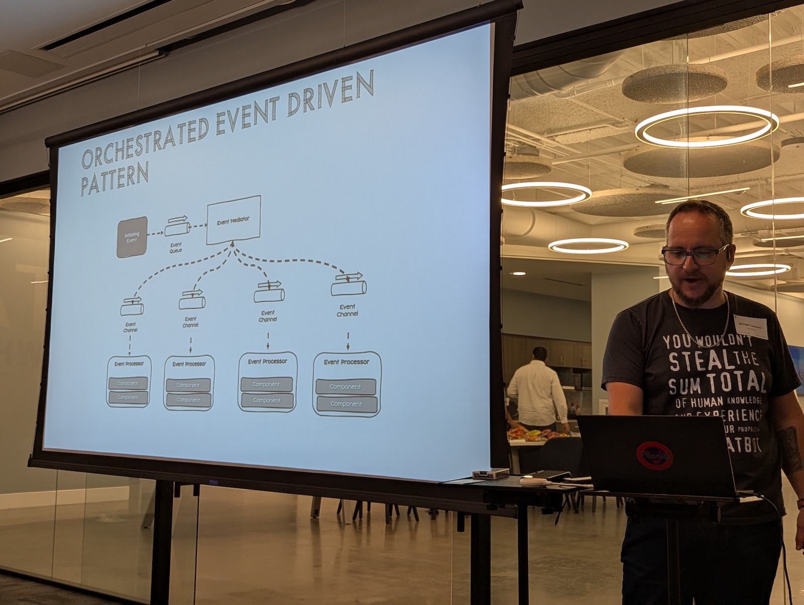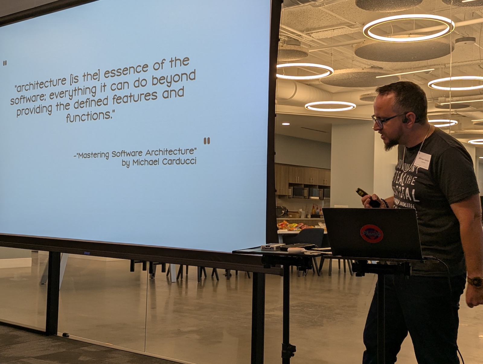 Last night, we had a “standing room only” crowd at Michael Carducci’s presentation, Architecture Patterns for AI-Powered Applications, which was held jointly by Tampa Java User Group, Tampa Devs, and Tampa Bay Artificial Intelligence Meetup (which Anitra and I co-organize).