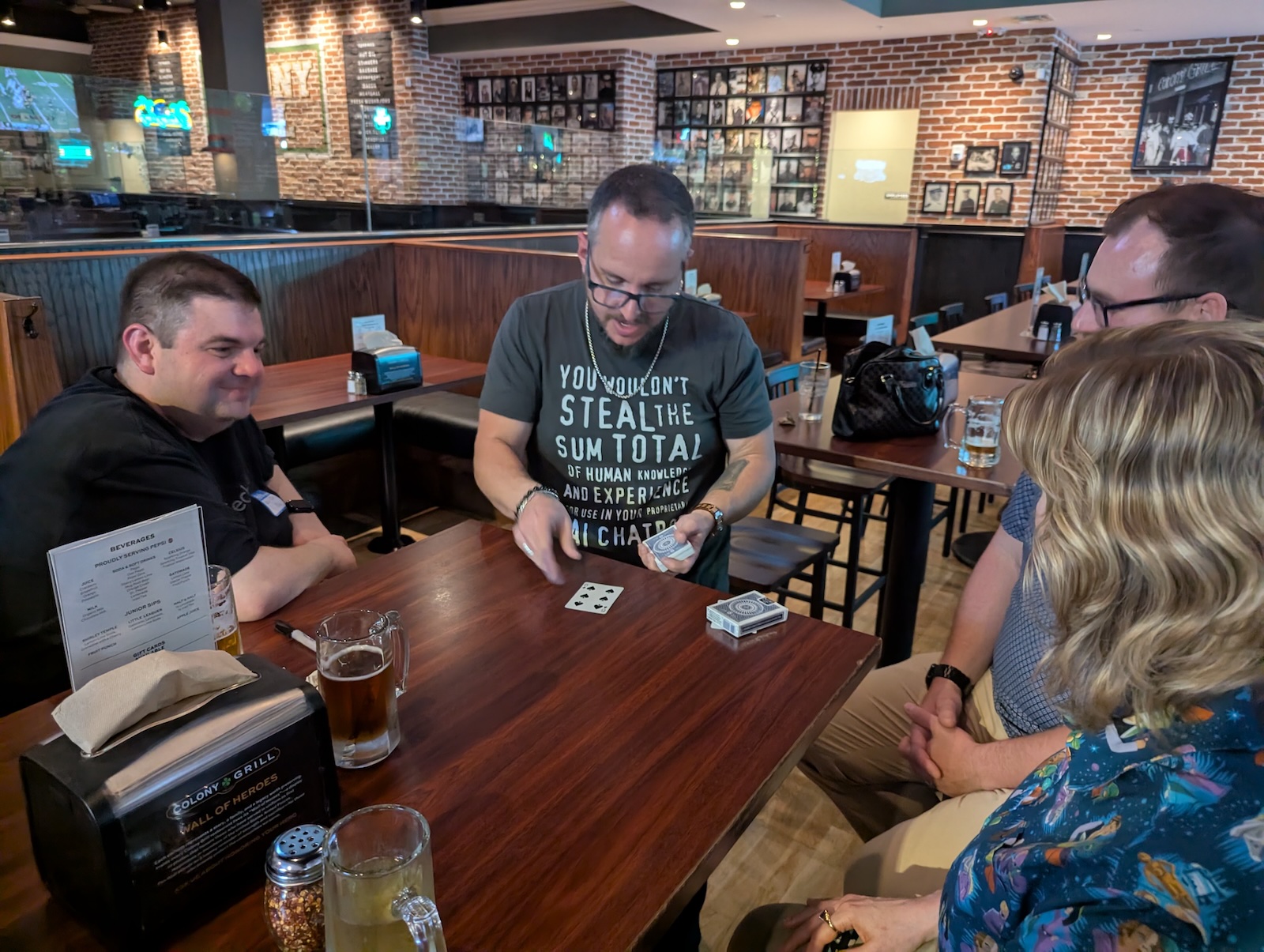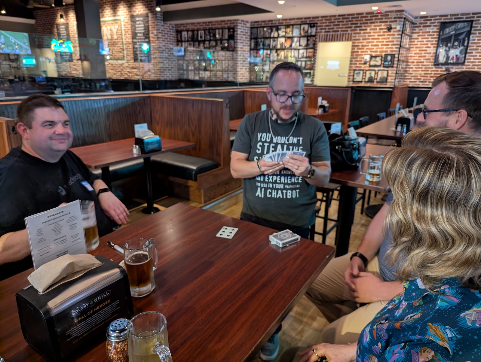 And once the presentation was done, a number of us reconvened at Colony Grill, the nearby pizza and beer place, where we continued with conversations and card tricks.