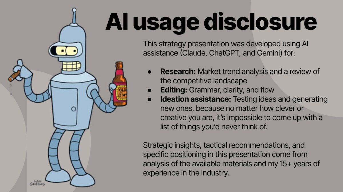 I’ve been doing a fair number of client proposal and job interview presentations lately, and one of the most-enjoyed slides is the very first one I show, pictured above. Everybody loves Bender!