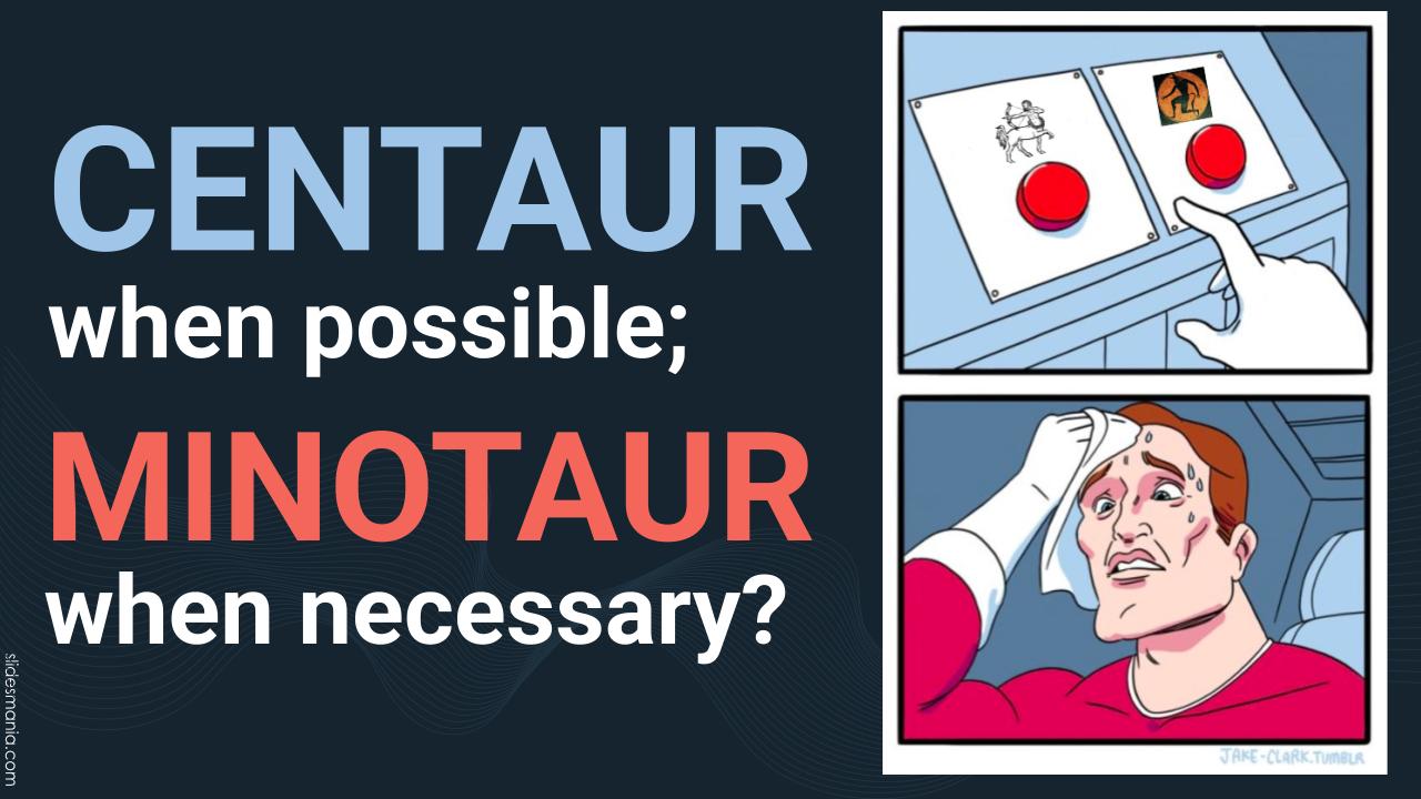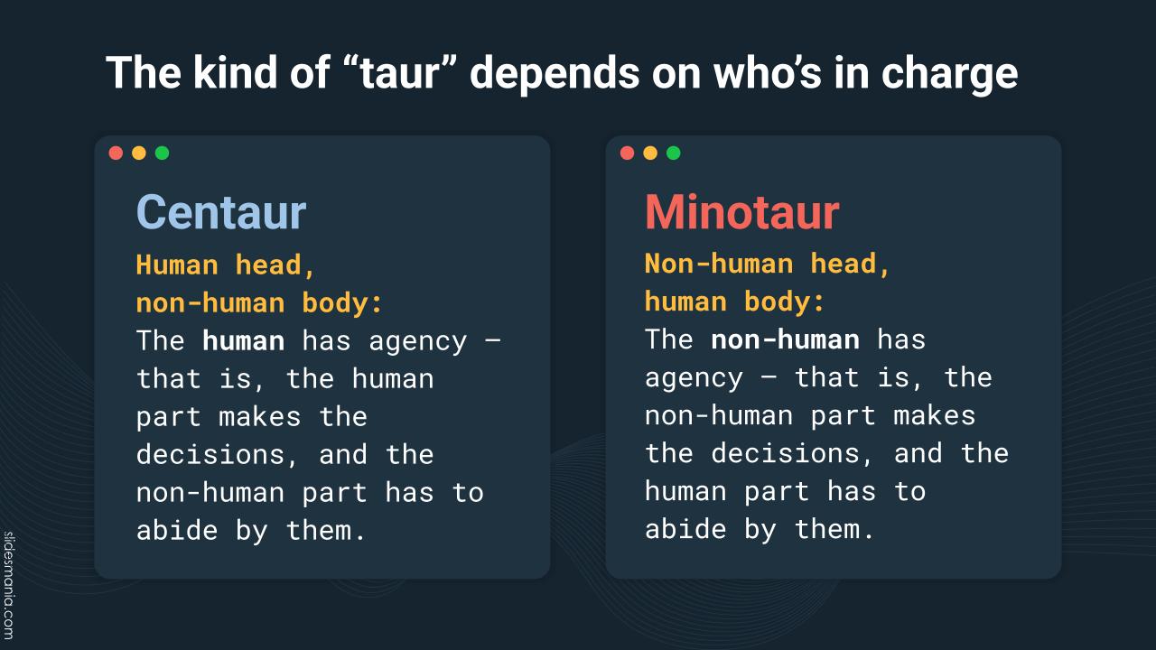 In AI terms, the minotaur is the “opposite” of the centaur. The centaur is a human head in charge of a non-human body, while the minotaur is a non-human head directing a human body. For a “minotaur” AI/human combination, the AI directs the human.