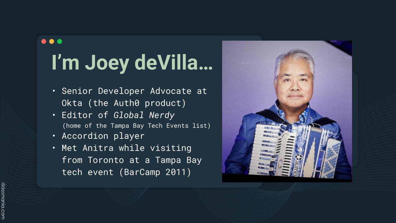 The mandatory speaker bio slide. If you were wondering, my headshot comes from Vadim Davydov, an amazing headshot photographer based here in Tampa Bay. You can find out more about him at https://vadimdavydov.com/.