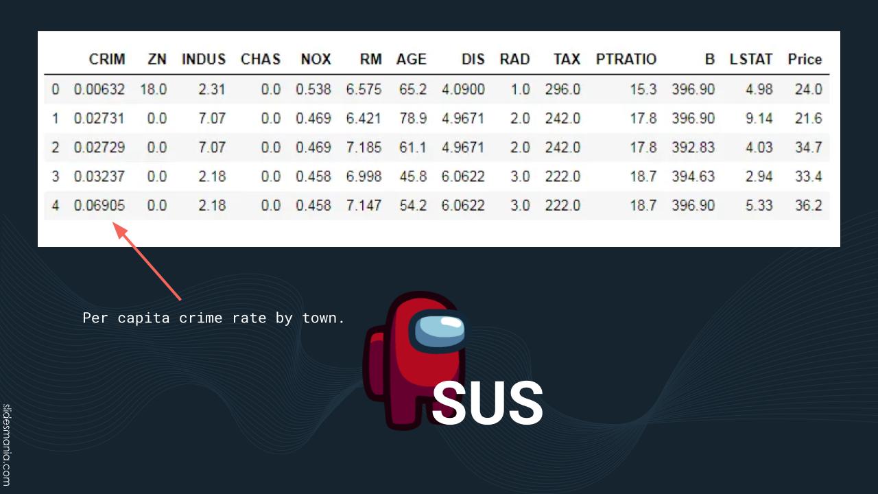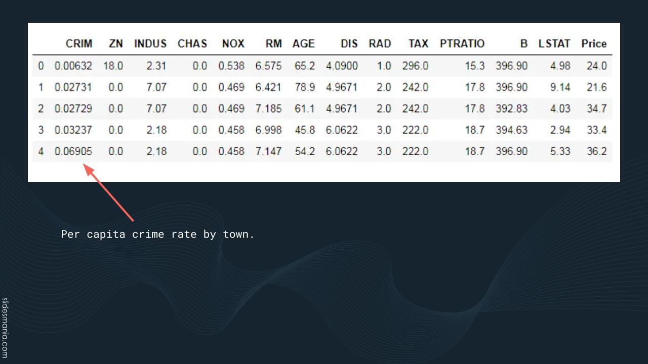 Like many datasets, the columns names are short. The CRIM column is short for “Per capita CRIMe” rate by town.