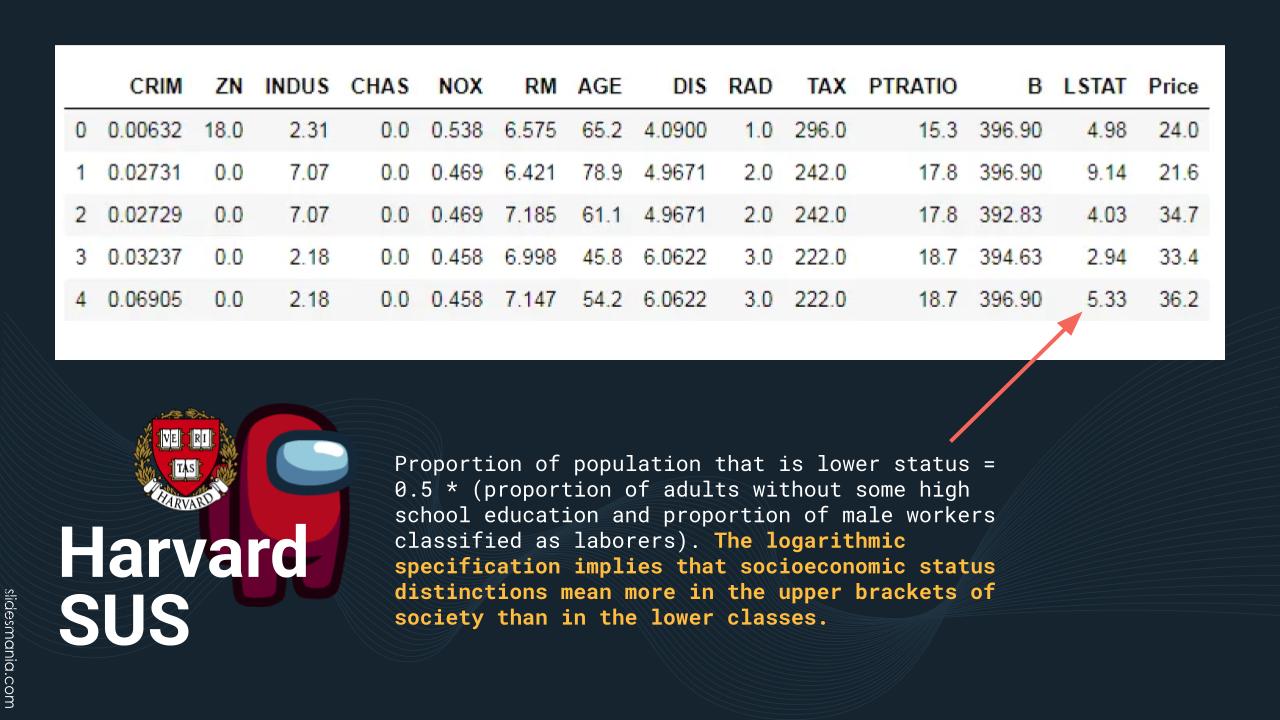 Then there’s the column named LSTAT, which is short for “Lower STATus,” where “lower status” means “a combination of people who didn’t get at least some time in high school and blue collar guys.”