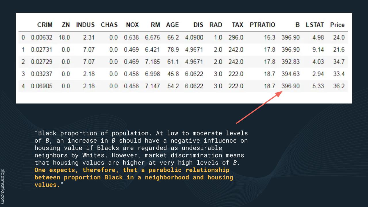 “Black proportion of population. At low to moderate levels of B, an increase in B should have a negative influence on housing value if Blacks are regarded as undesirable neighbors by Whites. However, market discrimination means that housing values are higher at very high levels of B. One expects, therefore, that a parabolic relationship between proportion Black in a neighborhood and housing values.”