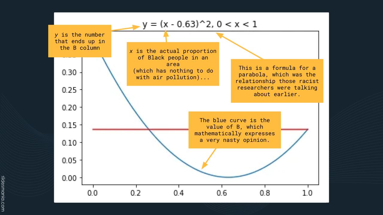 y is the resulting value that goes into the B column. x is the actual proportion of Black people in the area, as you can see that x has to be between 0 and 1 (that’s what the “0 < x < 1” part means).