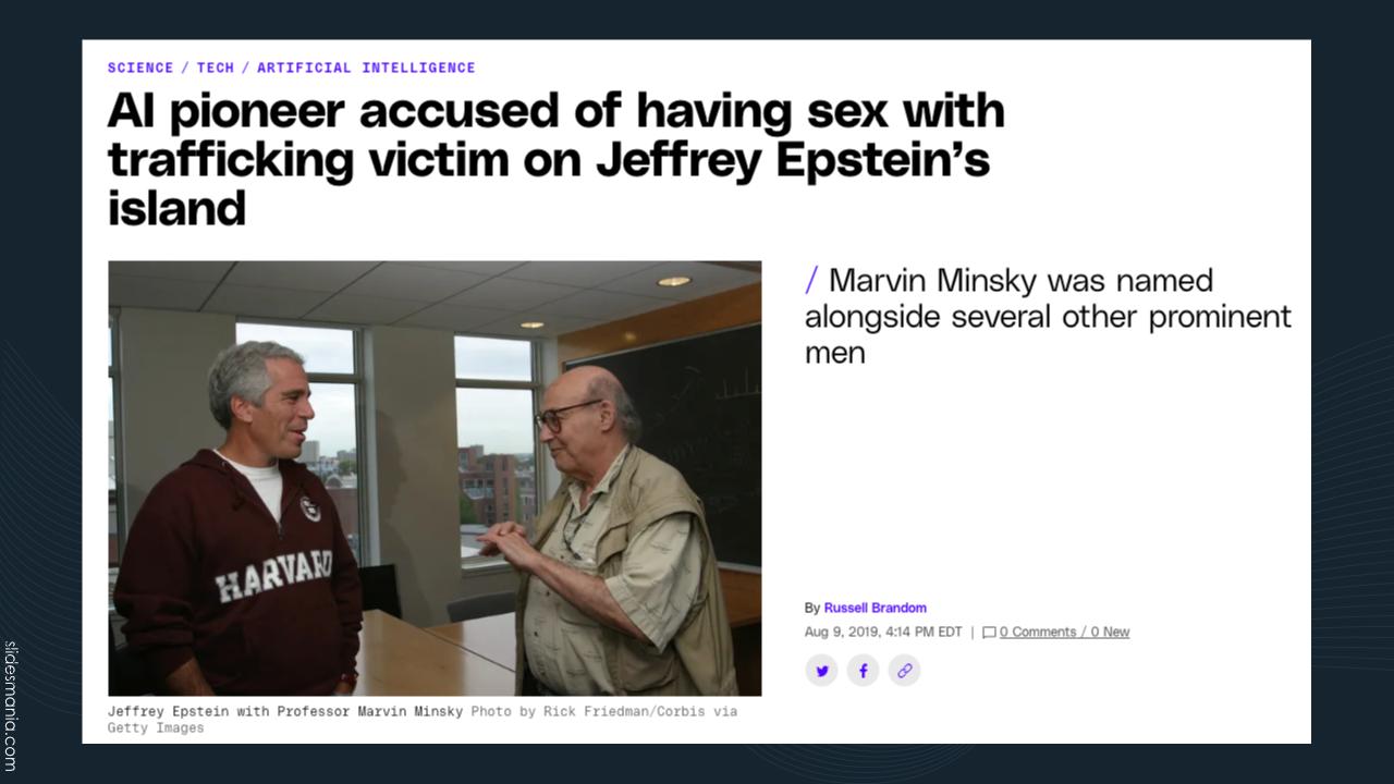 Alas, one of the big names in AI, Marvin Minsky — a cognitive scientist and computer scientist at MIT whose artificial intelligence work is foundational — held a couple of conferences on Jeffrey Epstein’s private island. And yes, this was AFTER Epstein was registered as a sex offender after pleading guilty in 2008 to soliciting a minor for prostitution. By that point, if you were going to the island, you at least knew what “recreational activities” he offered.