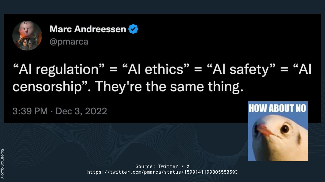 Ugh, this guy. First famous for helping create Mosaic, the OG graphical browser, then forming the VC firm Andreesen Horowitz, and now super-big AI proponent, but against anything that might slow down its development, even things like ethics.