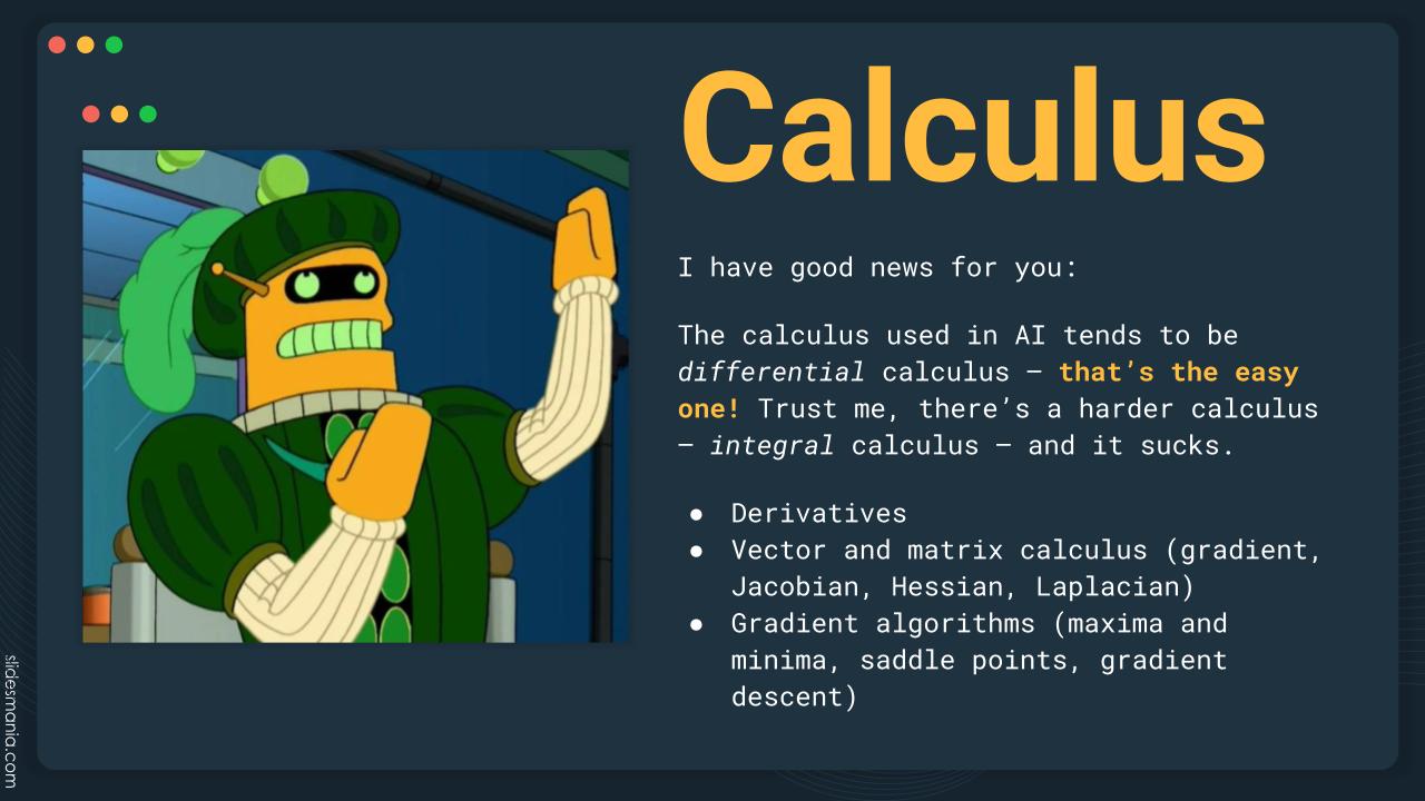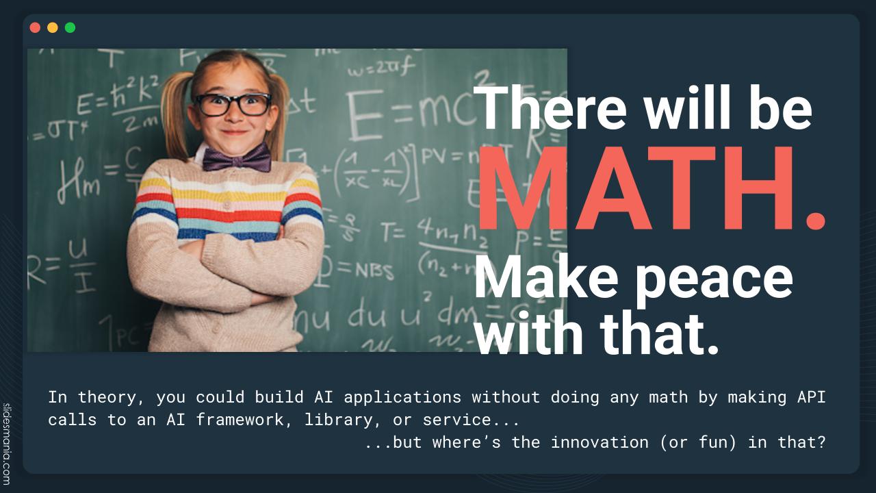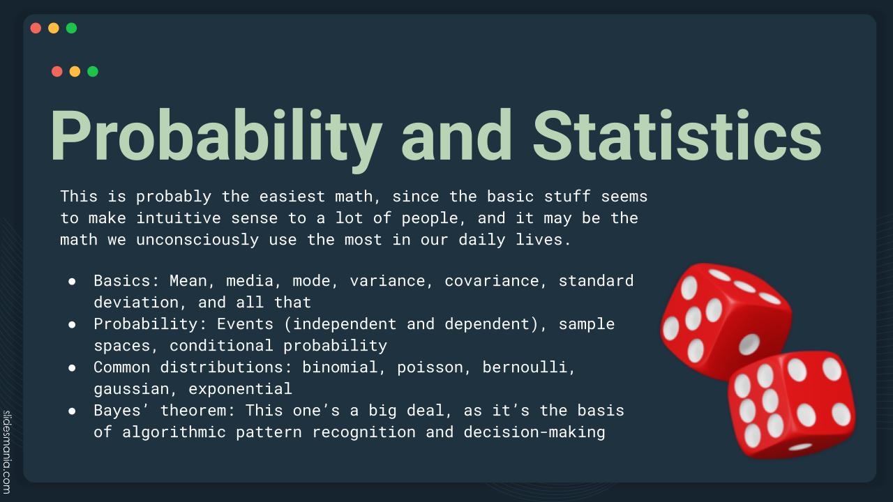But what if you want to build AIs yourself? If that’s the case, you’ll need to brush up on some math. There are a number of AI libraries that do a lot of the math for you, but you should at least learn the underlying principles. It’s like using a calculator or spreadsheet even though you know arithmetic.