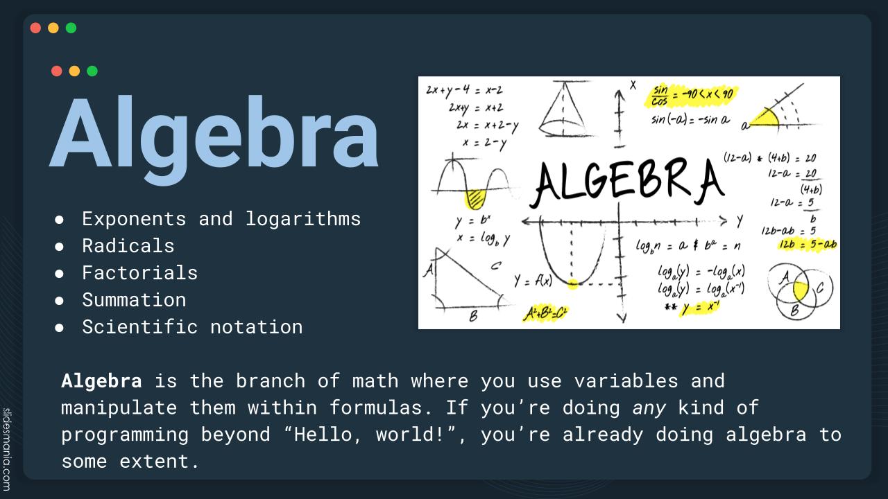 If you’ve written code to draw things onscreen, you’ve probably worked with x-, y-, and possible z-coordinates, and that’s part of linear algebra, which is the algebra of lines and planes.