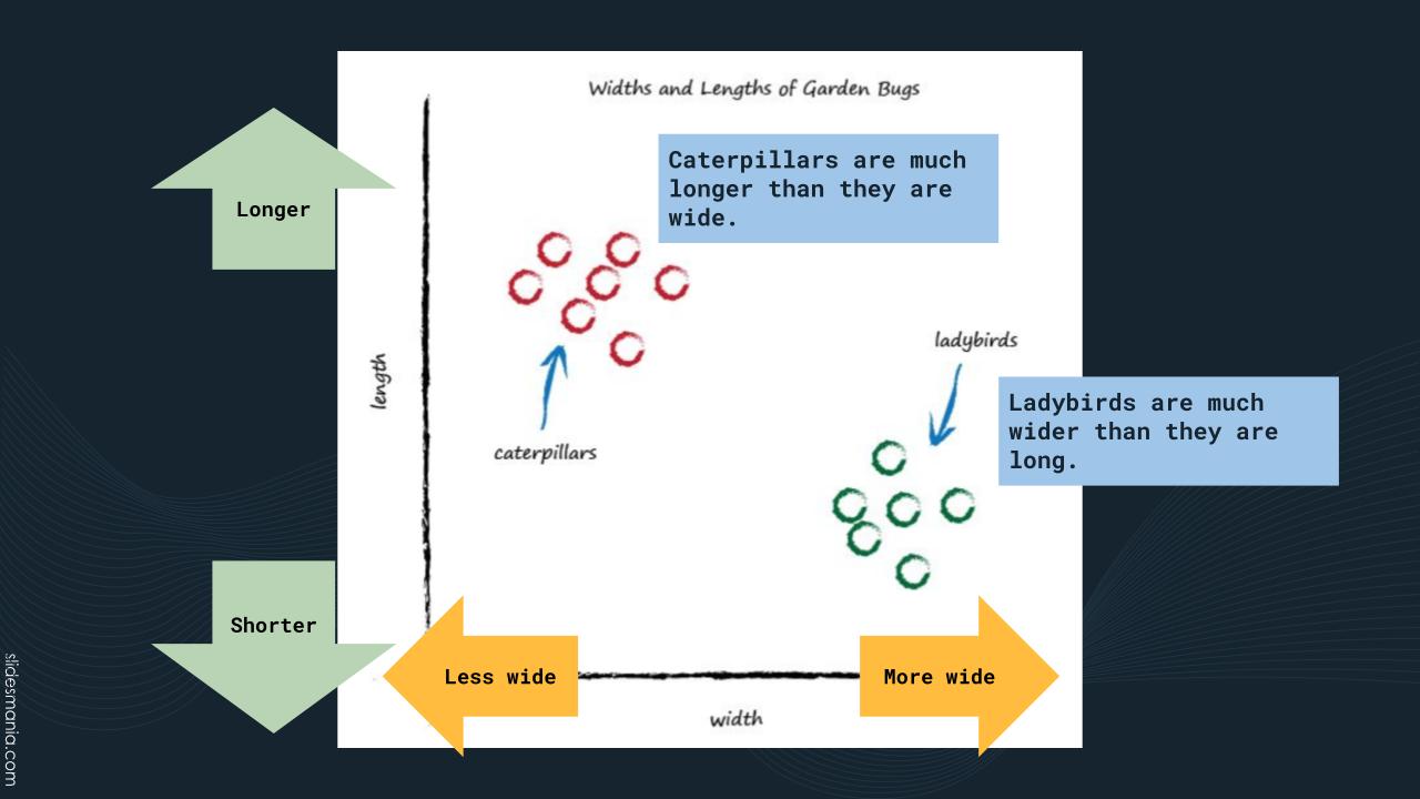 Suppose you’re working with two different kinds of garden creatures: caterpillars and ladybirds. Caterpillars are long creatures, and not very wide. On the other hand, ladybirds are wide creatures, but not very long.