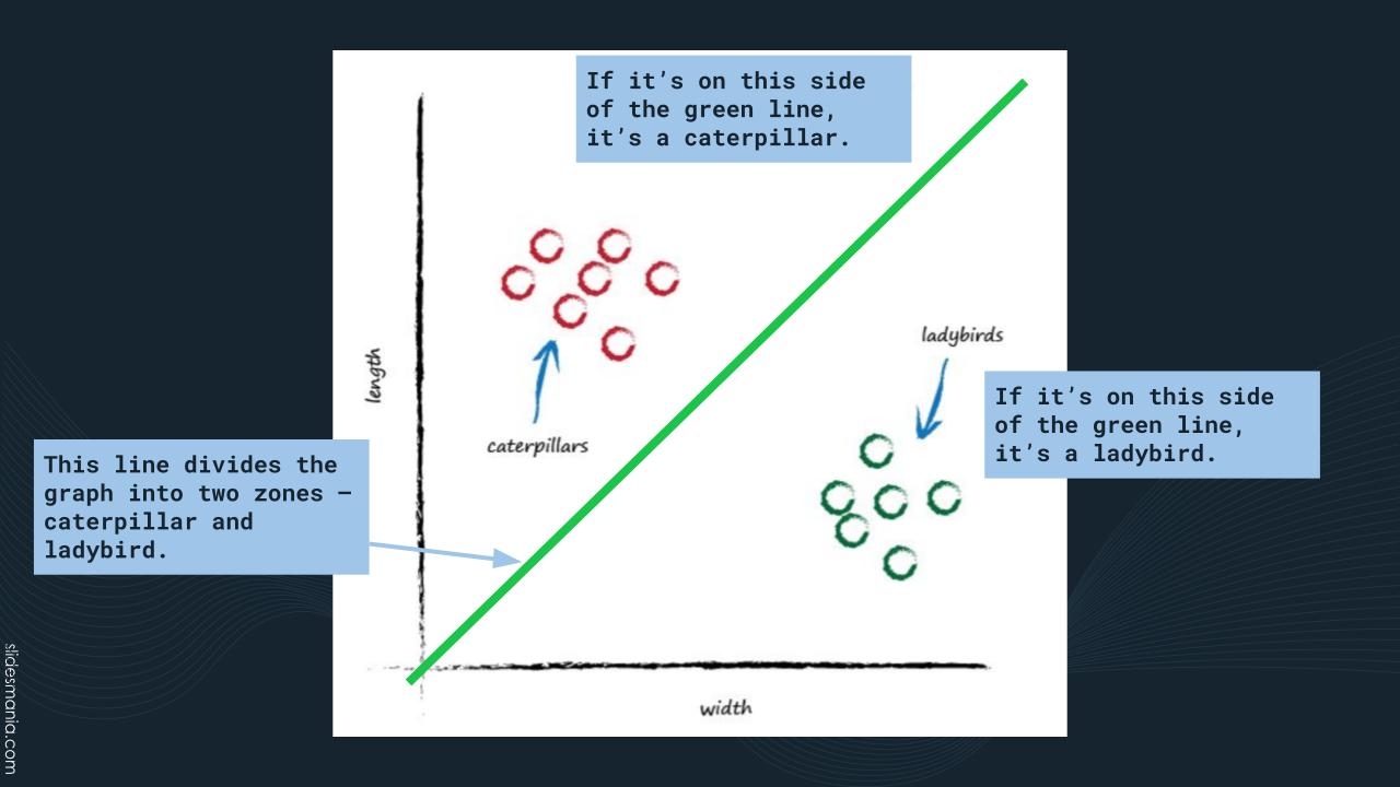 We can use linear algebra to find the equation of a line that divides the measurements into two different zones: one for caterpillars, and one for ladybirds. If a creature falls on the “caterpillar” side of the line, we classify it as a caterpillar. If it falls on the “ladybird” side, we classify it as a ladybird.