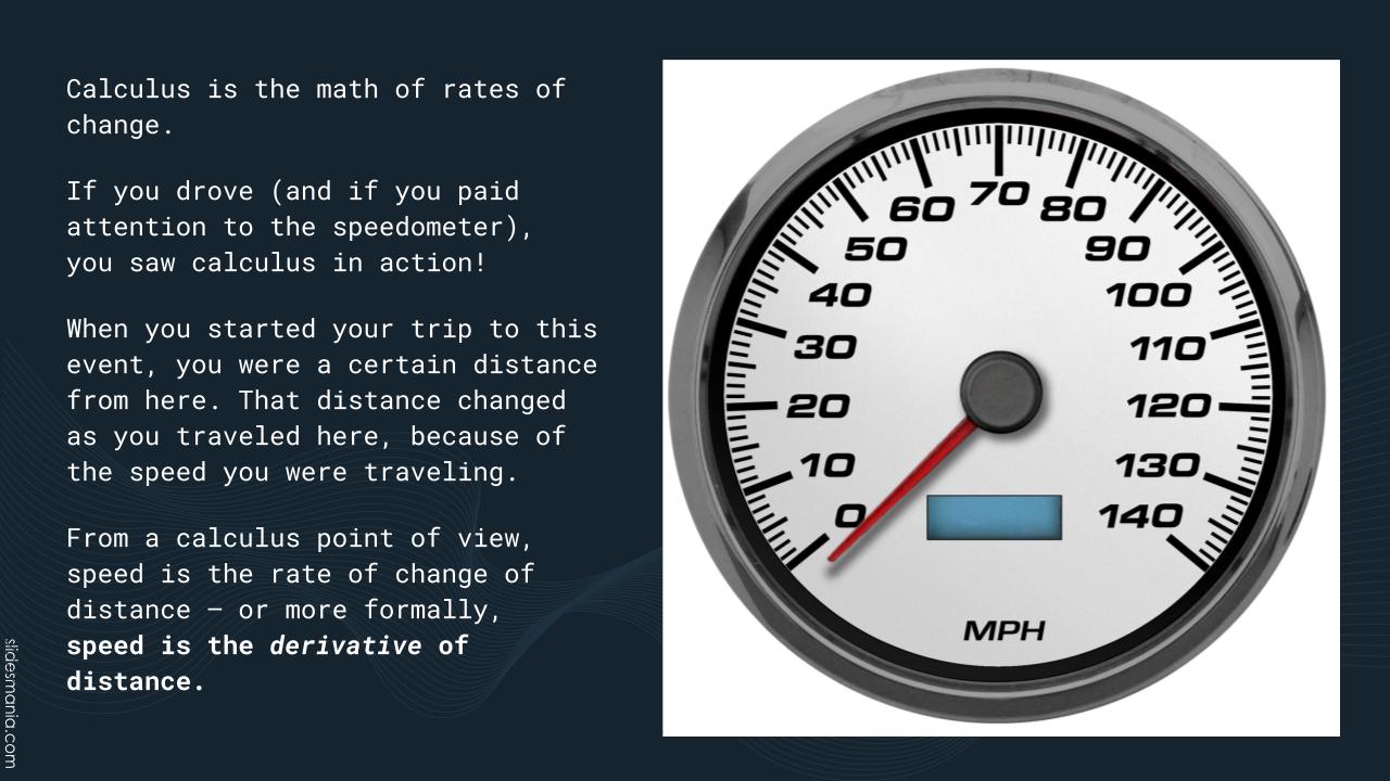 Speed is the rate of change of distance. You can see it in the way we express speed — in terms of distance over time (for example, 55 miles per hour).