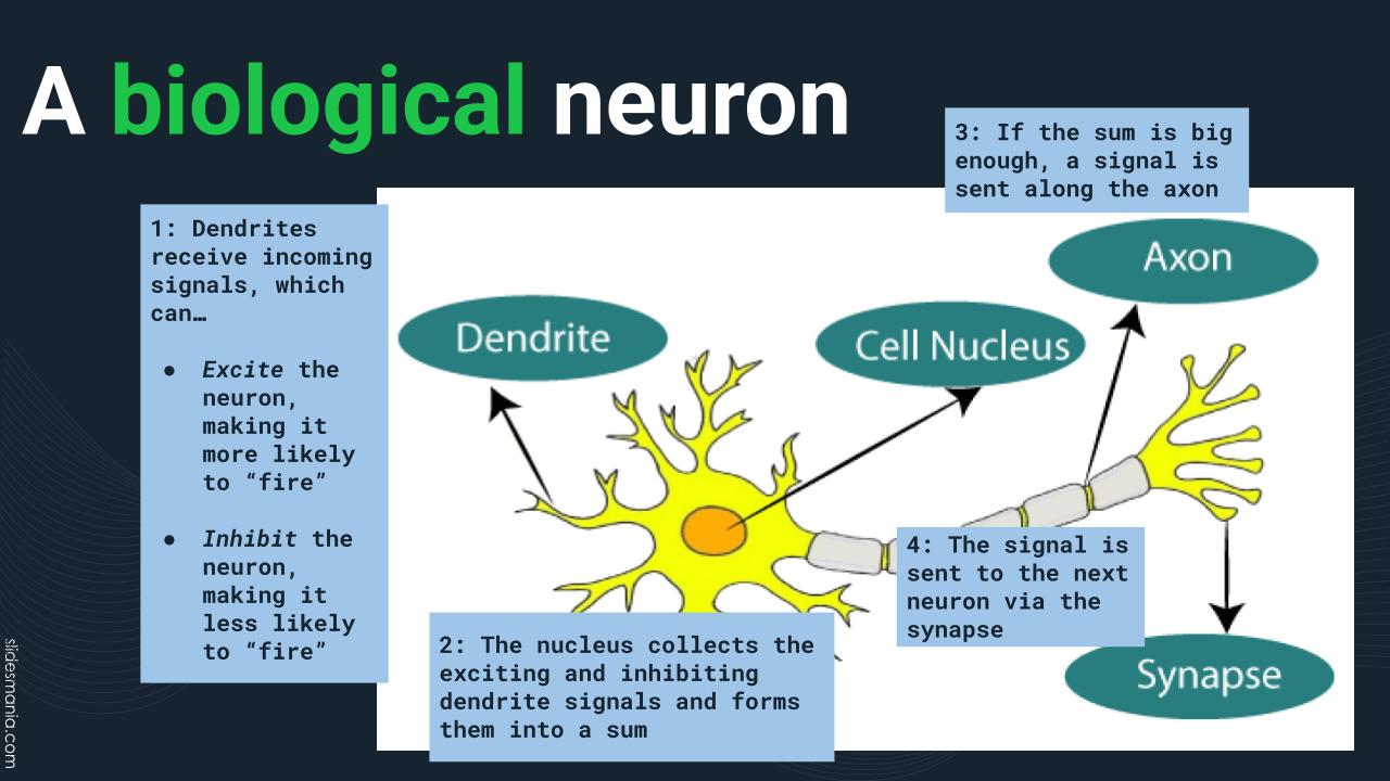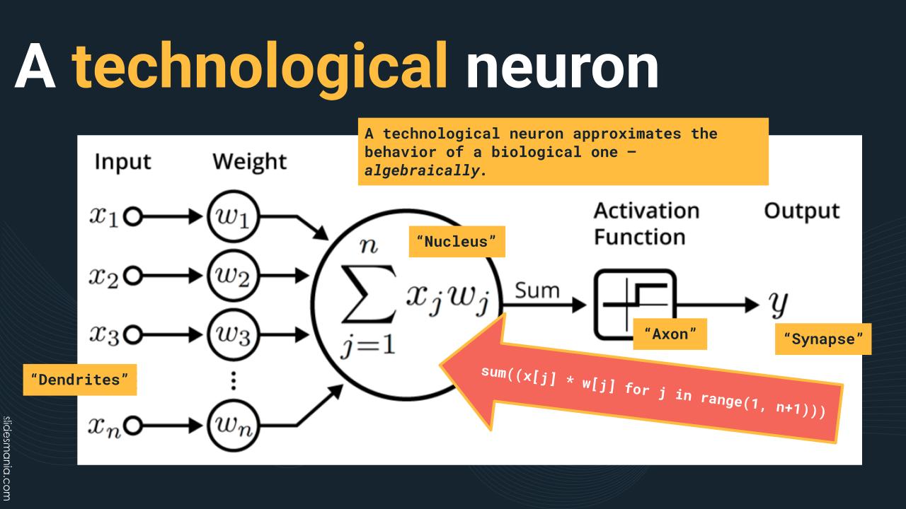 …and here’s a technological neuron. The dendrites are inputs that take in numbers, each of which is then multiplied by a weight value. These results are totalled into a sum, which is then run through an activation function, which activates only if that sum crosses a specific threshold. If the sum does cross that threshold, the neuron produces an output value, which is the equivalent of a biological synapse firing.
