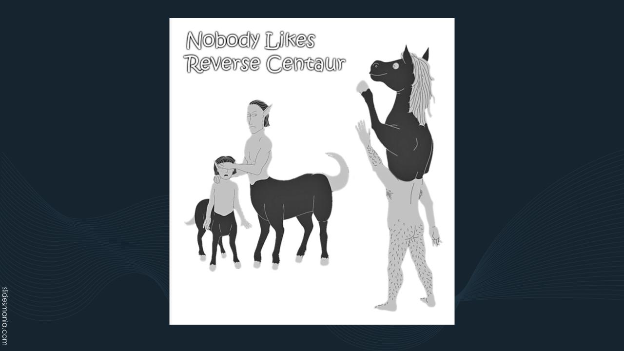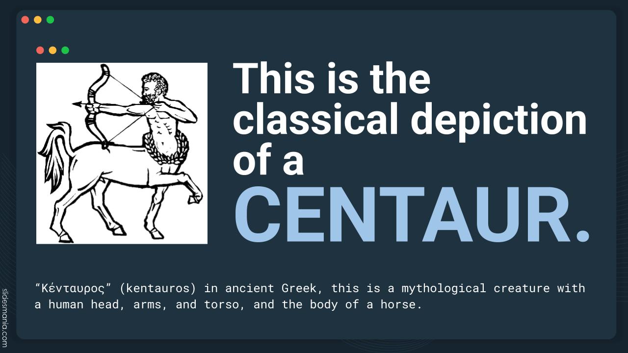 From greek mythology, a centaur is like a horse, but with a human head, arms, and torso where the horse’s head would normally be.