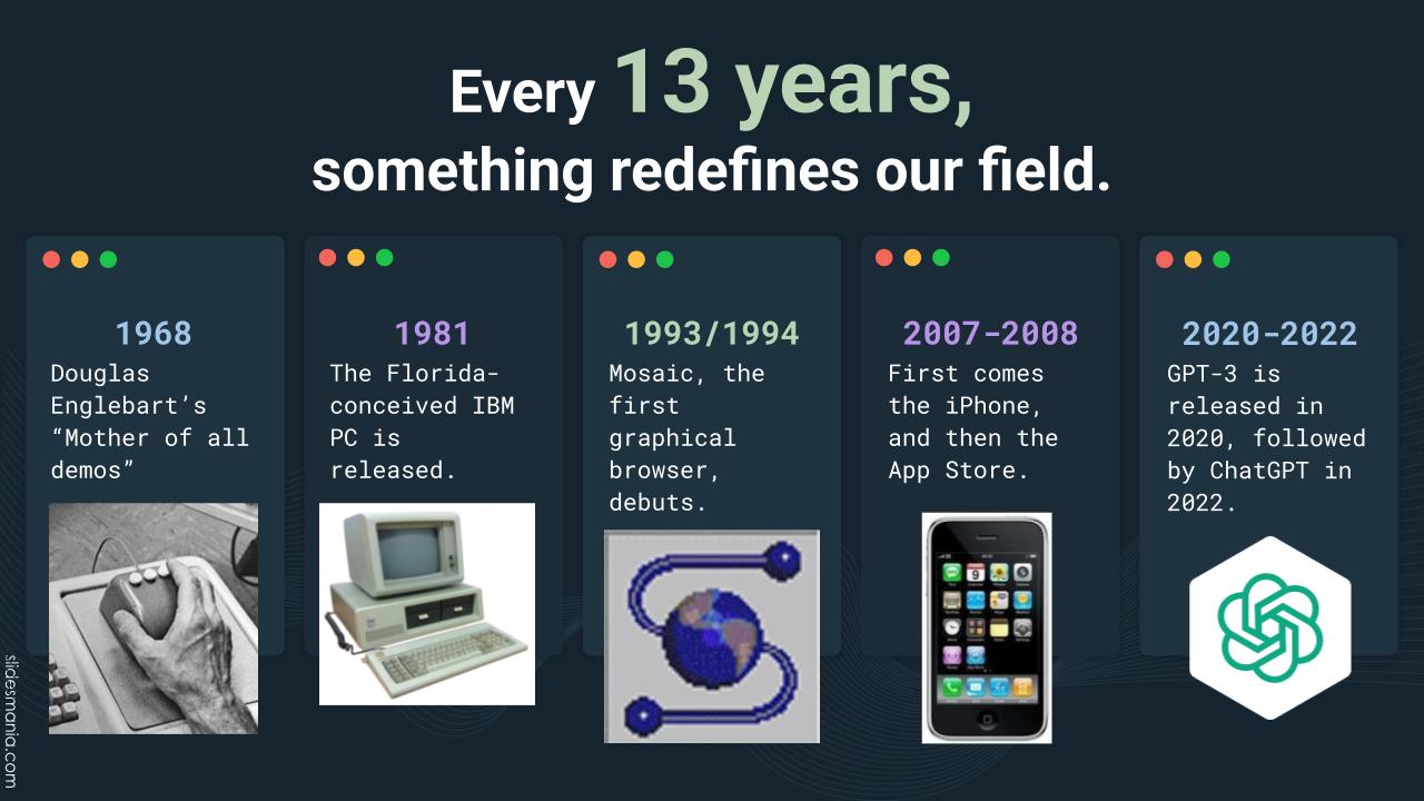 13 years before 1981 is 1968, when The Mother of All Demos took place — Douglas Englebart’s demonstration of what you could do with computers, if they got powerful enough. He demonstrated the GUI, mouse, chording keyboard, word processing, hypertext, collaborative document editing, and revision control — and he did it Zoom-style, using a remote video setup!