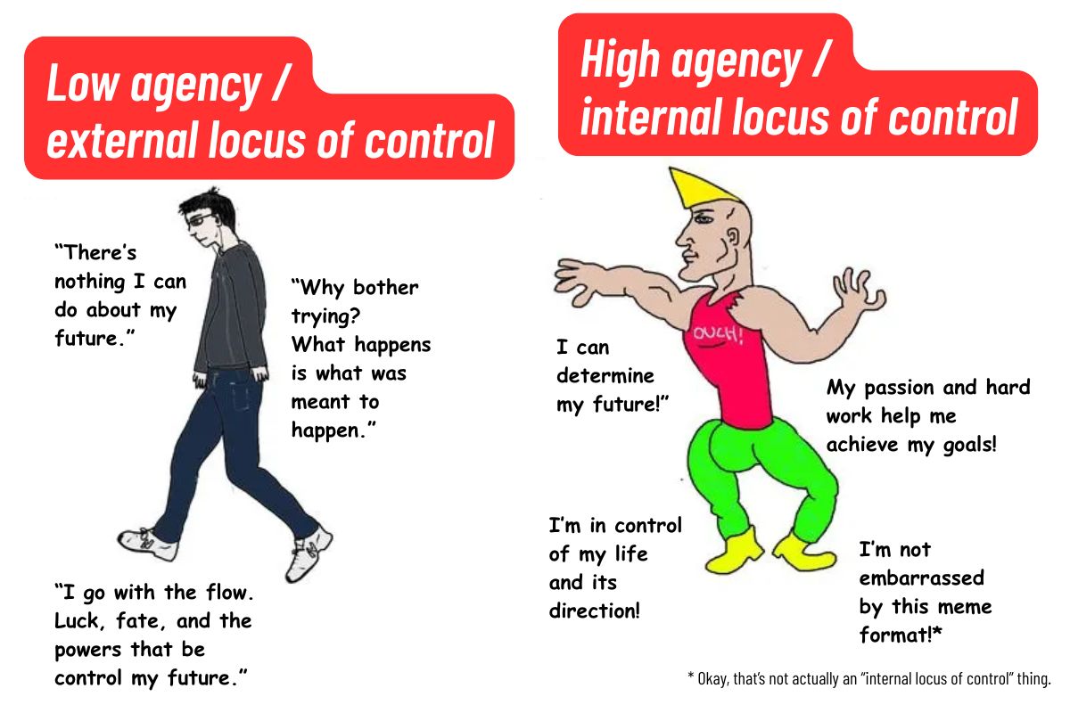 High agency sounds like a feeling of confidence, self-assuredness, or empowerment. It’s best understood through the theory of Locus of Control, which psychologist Julian Rotter developed in the 1950s.