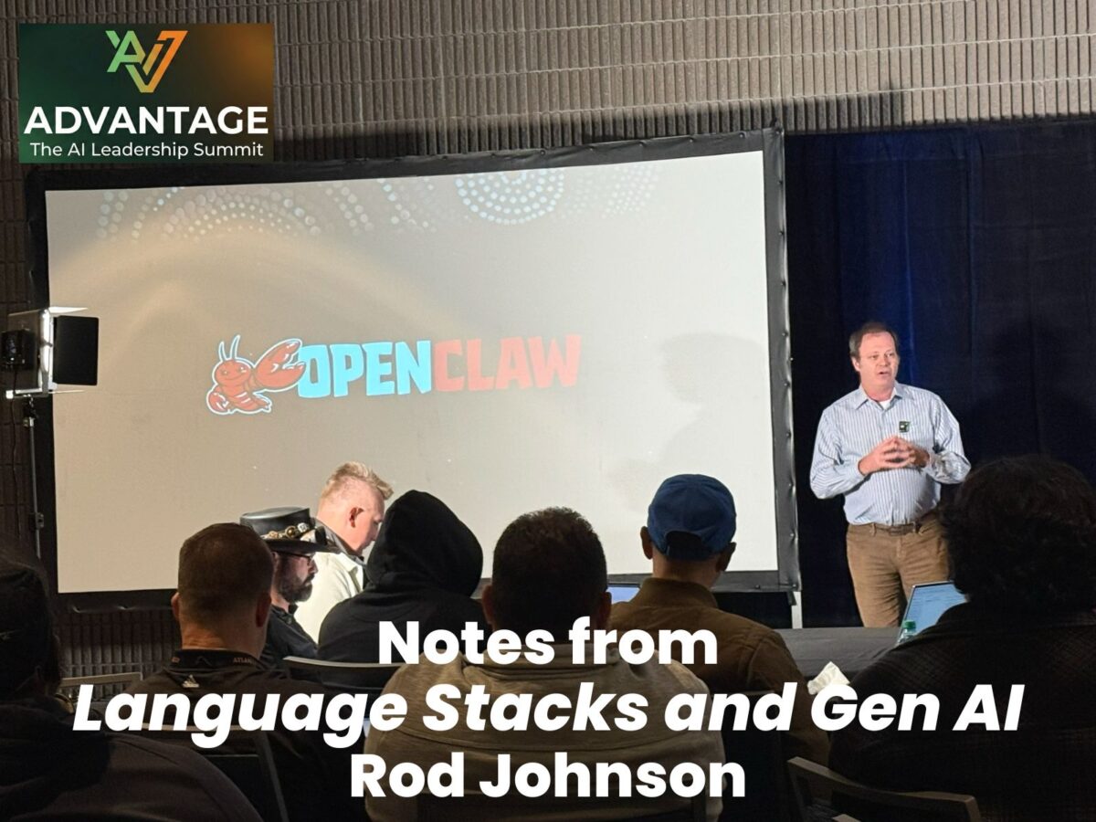 I took copious notes and photos of all the Advantage talks and will be posting summaries here. This set of notes is from the third talk, Language Stacks and Gen AI, presented by Rod Johnson.