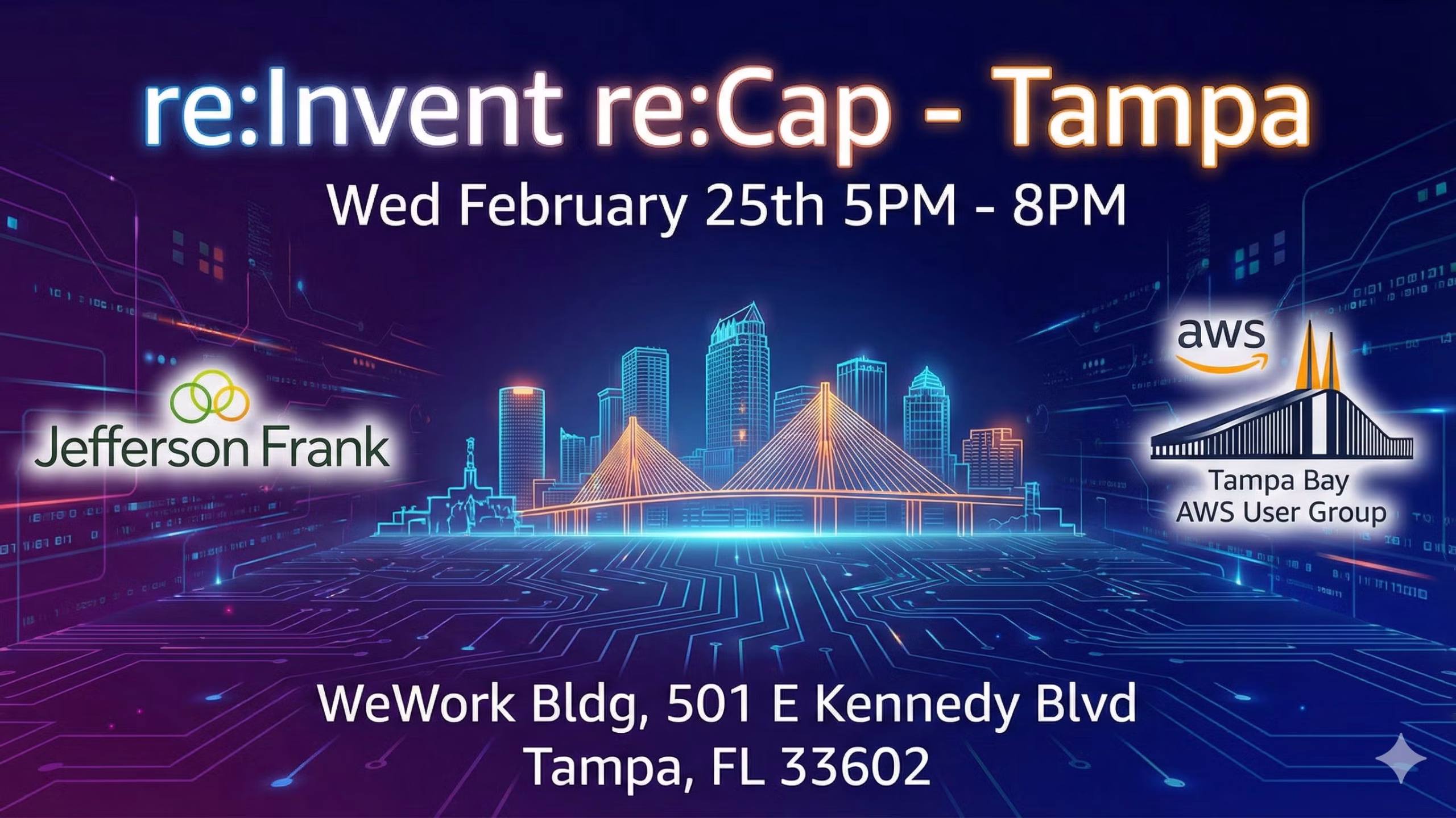 Wednesday at 5:00 at the WeWork Building (Tampa): Get a comprehensive summary of key re:Invent 2025 announcements and insights from the keynotes, followed by three deep dive sessions selected from the most popular re:Invent presentations covering Amazon Bedrock, AgentCore, Kiro, and Amazon Quick Suite.