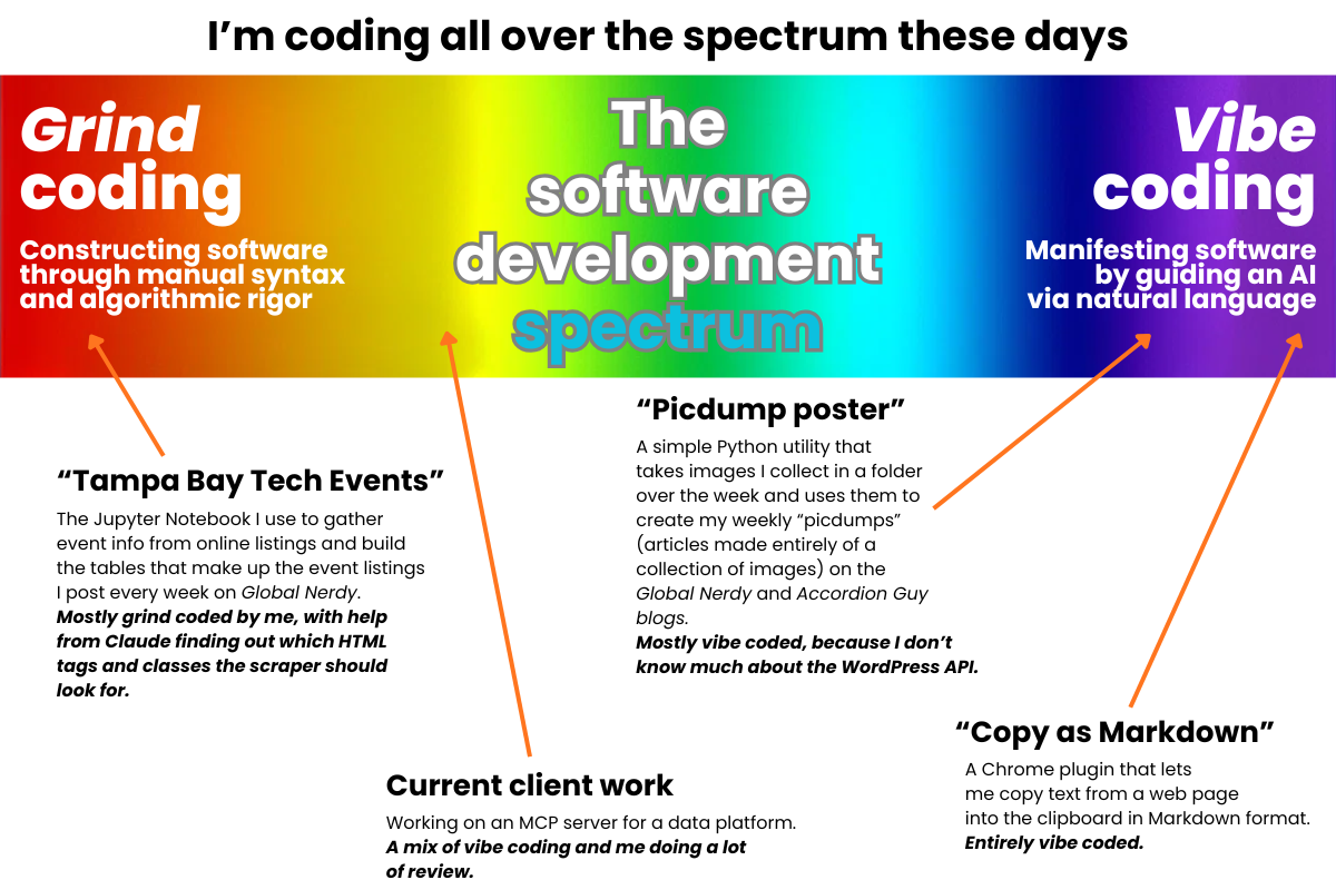 Having these two terms also makes it clear that there’s a spectrum between these two styles. For instance, I’ve done some “mostly grind with a little vibe” coding where I’ve written most of the code and had an LLM write up some small part that I couldn’t be bothered to write — a regular expression or function. There’ve also been some “most vibe with a little grind” cases where I’ve had an LLM or Claude code do most of the coding, and then I did a little manual adjustment afterwards.