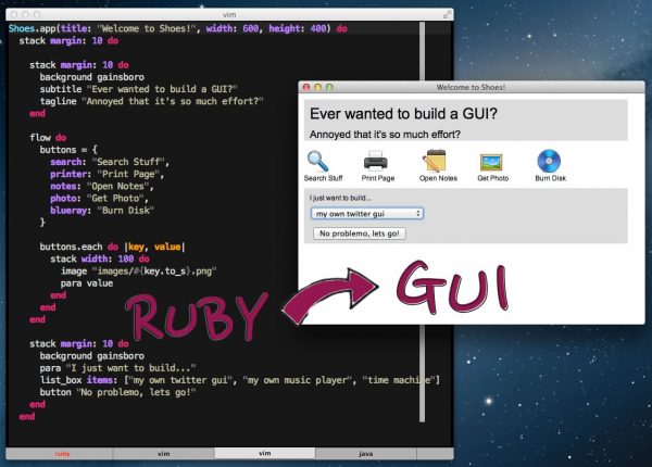 His solution to the Predicament was to first write Shoes, a simple toolkit for Ruby that use web page concepts to build desktop GUI apps for macOS, Windows, and Linux: