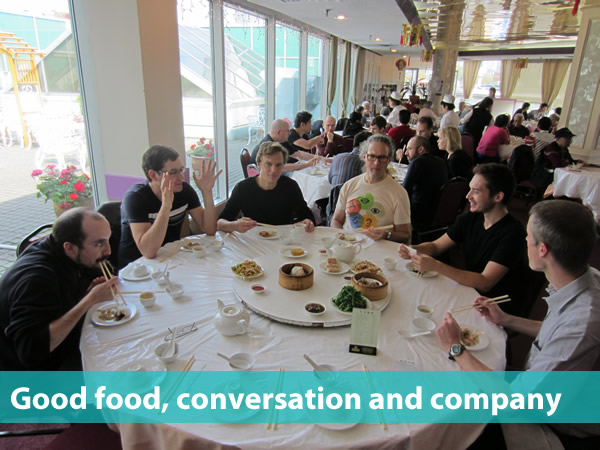 There were a number of dim sum “alumni” who showed up, including Andrew Burke, who wins the Phileas Fogg award for greatest distance travelled to attend — he’s visiting from Halifax. We also had some people who’d never been to one of these events before, including my cousin Saturn, making it an event with not only figurative, but literal family! As always, it was one of those wonderful things that happens when good people meet over good food and make good conversation. I bounced between tables, either meeting people for the first time or catching up with old friend. And it was pretty inexpensive too — it worked out to about eight bucks a person, and we all ate our fill.